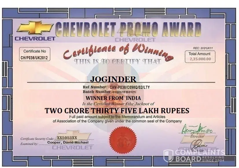 We are excited to have you as our lucky winner in this year 2016 Chevrolet Mobile Draw, sponsor in conjunction with British Co-operation. We facilitate with you and your family and specially for being a citizen of (India). All participants were selected through an internet ballot system. This promotion was set-up in united Kingdom to promote our new product, This promotion is approved by the British Gaming Board and also licensed by the International Association of Gaming Regulators (IAGR). This promotion is the 1st of its kind and we intend to sensitize the public.You have been approved to received a demand draft containing Two Crore's Thirty Five Lakh India Rupees ( Rs 2, 35, 00.000.00/INR) and a Chevrolet Car Key by a delivery Officer from Trans-Global Courier Service. You're Demand/draft together with all documents that will facilitate delivery and transfer of your prize to India has been parceled for delivery, it will be hand over to you by the delivery Officer who will depart from United Kingdom tonight, and arrive in India tomorrow Morning due to arrangement with the British Airway.