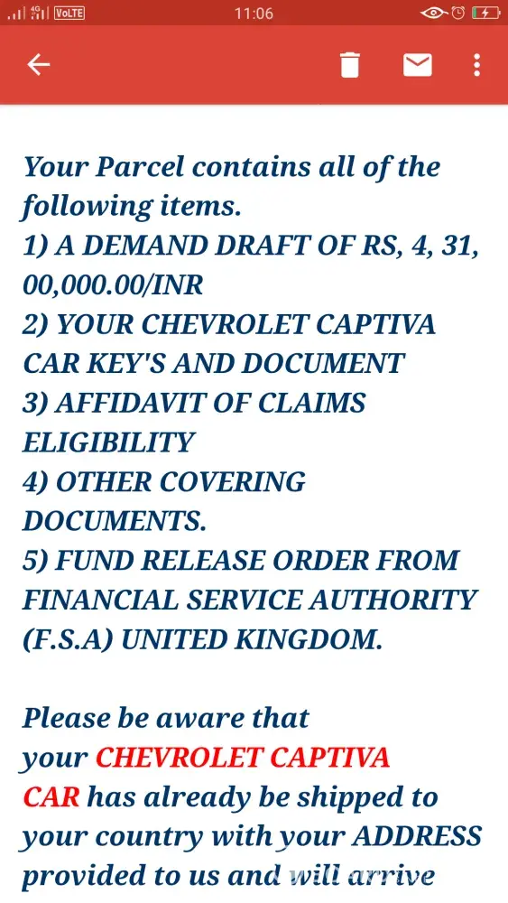 This is to inform you that your email have won you (3crore.35lakhs rupees) and a brand new (chevrolet captiva 2019 model car)