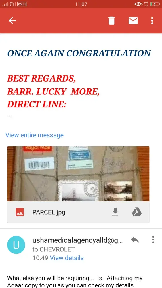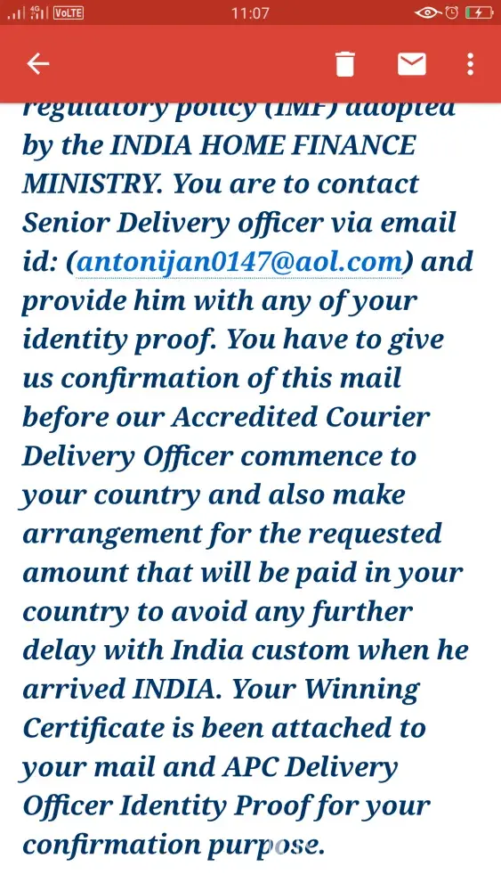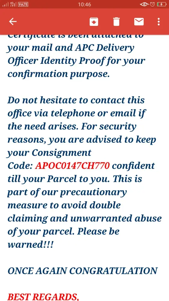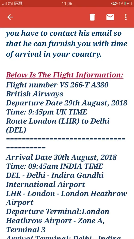 We received and have noted your delivery address sent to us. This is to bring to your notice that you will be receiving your parcel in India, this office will be sending a diplomat from UK to India for your delivery, Our delivery Diplomat by name, Diplomat John Williams will be leaving from England and will arrive your country on TUESDAY Morning 03/08/2019 in NEW DELHI (INDIA)