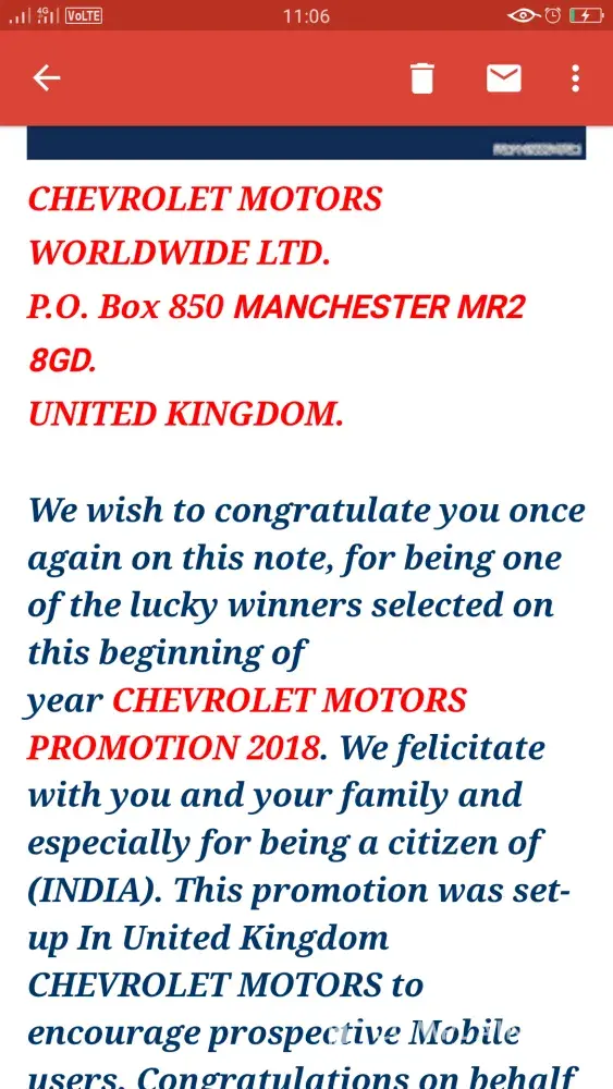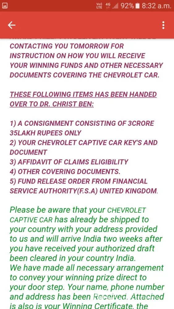 I have are received an email stating I won a Chevrolet car and cash price from London