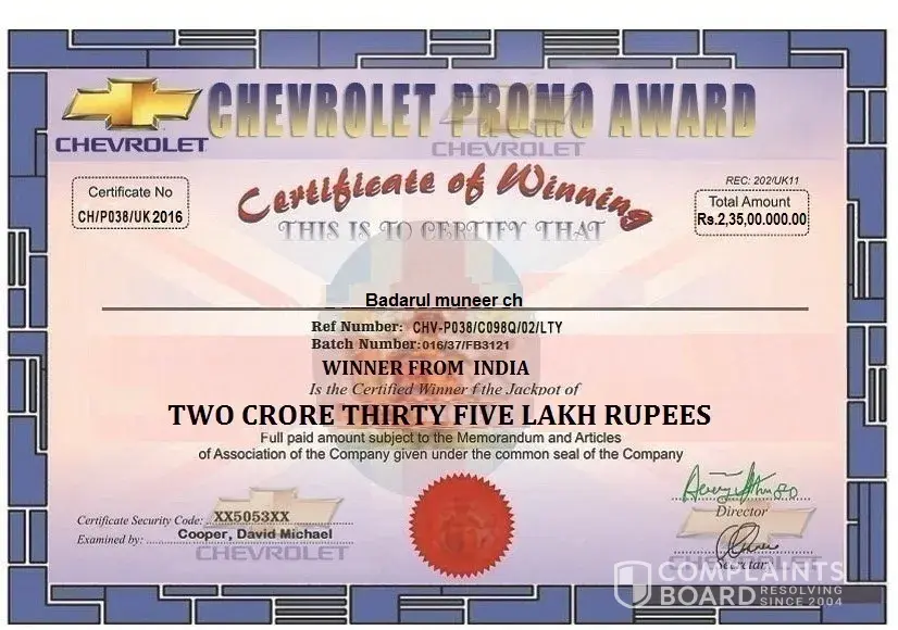 12 Chevrolet Car Lottery Promotion Award London Complaints