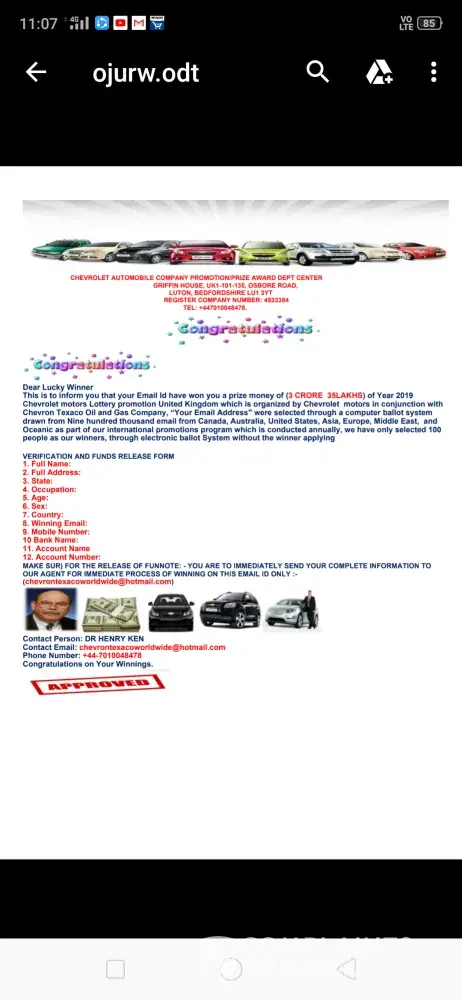 Chevrolet online lottery Chevrolet uk ltd. Uk1 - 101 - 135 Osborne road Luton, bedfordshire lu1 3yt. United kingdom. Winning notification This is to inform you that you have been selected to receive the award sum of £500, 000. 00 (Five hundred thousand pounds sterling) from the chevrolet 2009 award donation. All beneficiaries email addresses were...