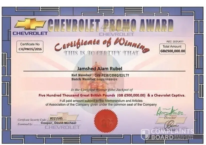 Chevrolet Car Lottery Promotion Award London review: is it real or fake? ( 20 comments)