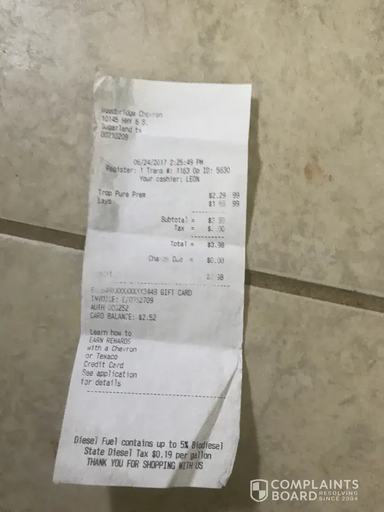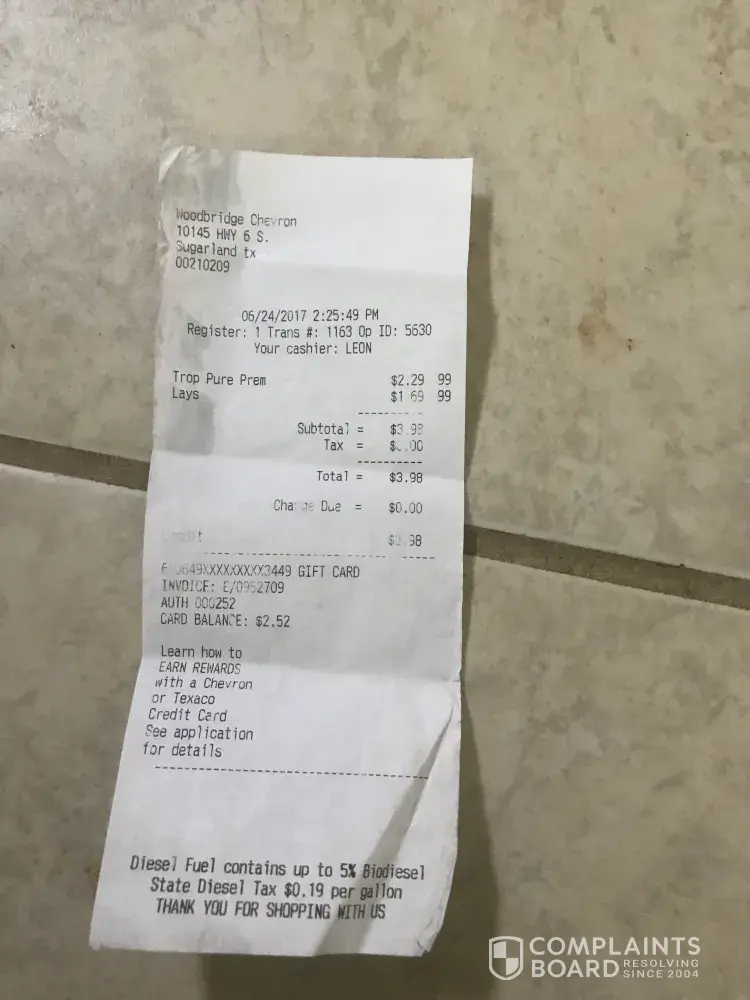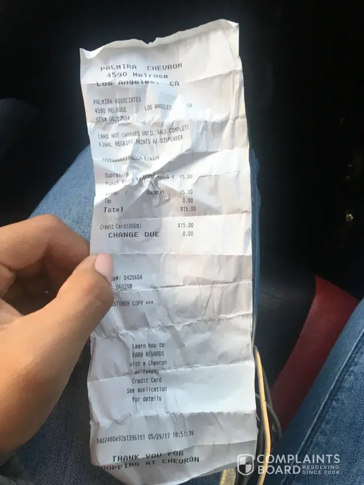On 4-24-17 I purchased gas from Chevron station number [protected] at 8402 Evergreen Way in Everett Washington. Invoice number