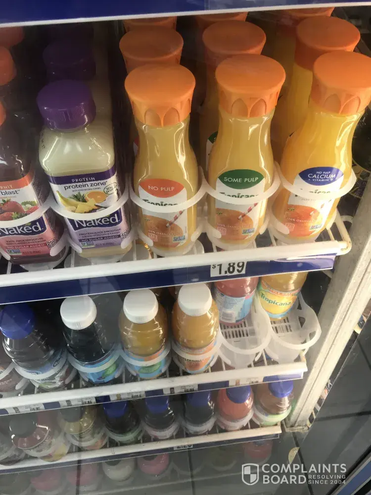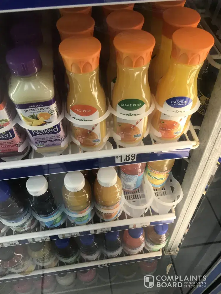 I buy juice Tropicana orange juice, the price on display $1.89. The cashier charge $2.29.