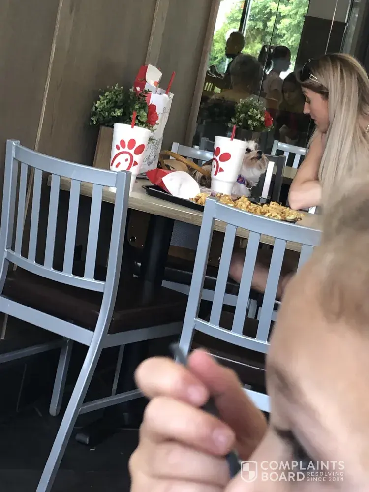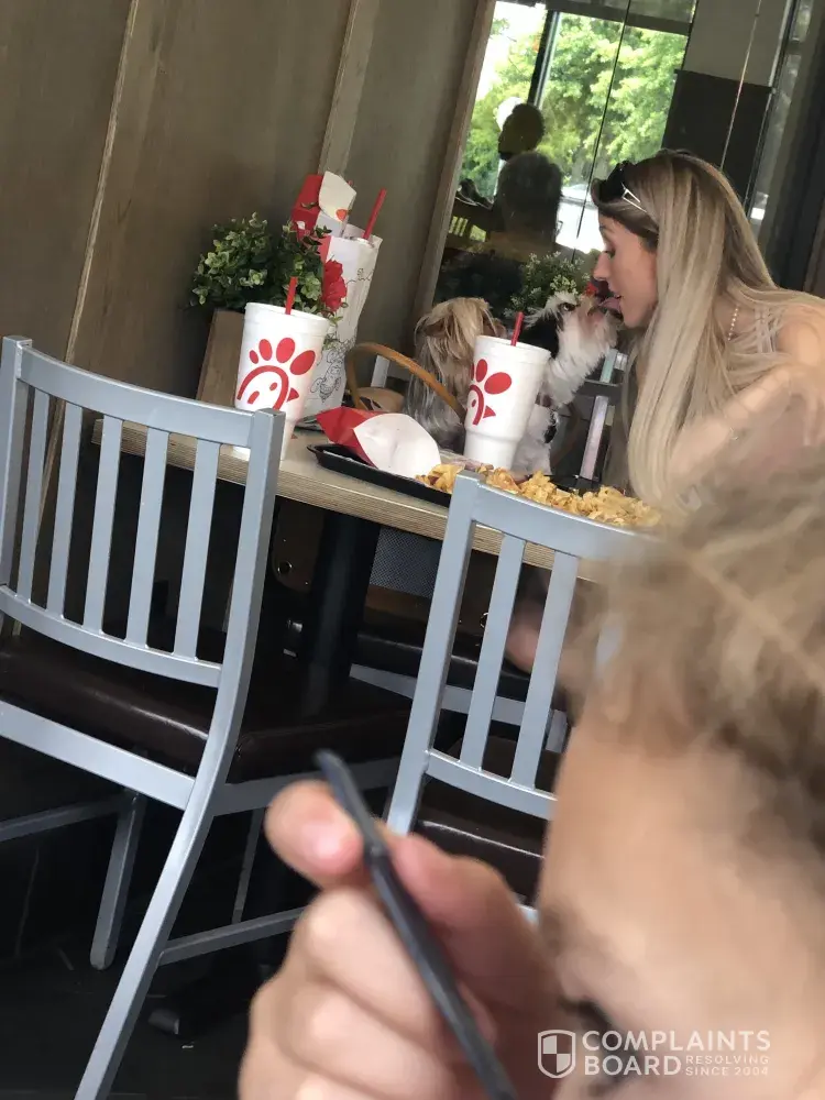 This was at the Evans Chick-Fil-A today. I'm tired of people treating their pets better than their kids. This lady got up and left 3 small children, 1in a high chair alone, but made sure she took her not one but 2 so called service dogs! It was disgusting eating and having those dogs at the table across from us. Enough is enough. A real service dog would sit at the foot has his master and not eat off the restaurant table. The workers actually engaged in conversation to say how cute! 🙄😳