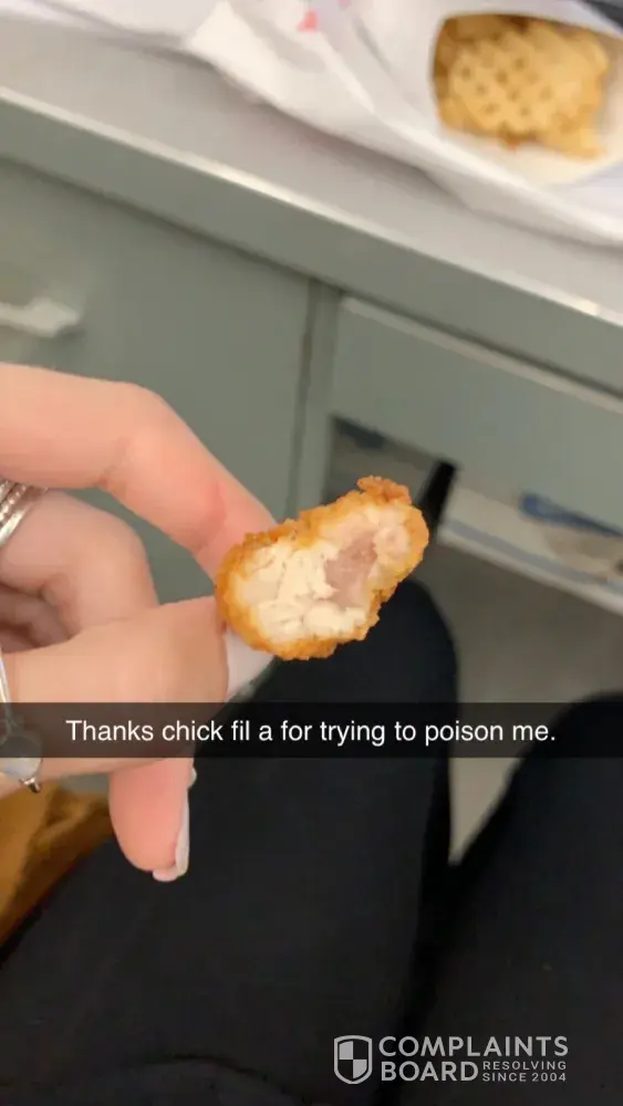 I'm 15 weeks pregnant and was served raw chicken nuggets. I went through the drive through which the girl who took my order 5 cars back from the menu didn't have one on hand and after getting cold soggy fries and a sprite that had zero ice and no carbonation in it as if it was sitting there all morning I let it slide until I bit into this. I'm extremely disappointed as I could not eat my lunch and would like to know how this will be resolved.