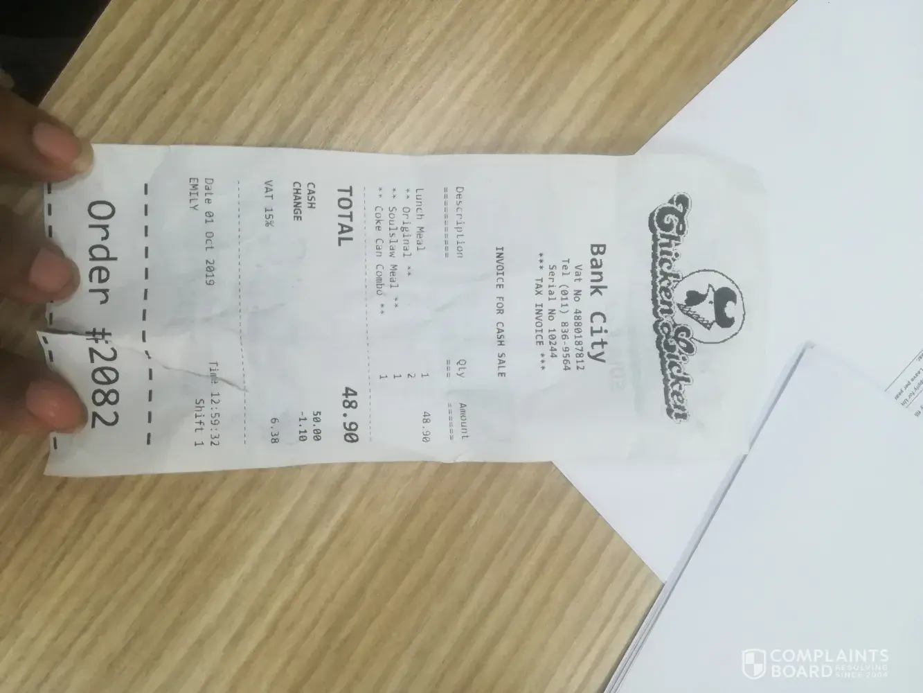 I went and bought the original lunch meal at Chicken Licken Bank City. I left while the order was being prepared and returned a few minutes later and another customer was returning an order and the agent at the store took back the order only to hand it to me when she was assigning my order, I inspected the order and it was already eaten and so I returned it to her and told her i cant accept it as it was already eaten.