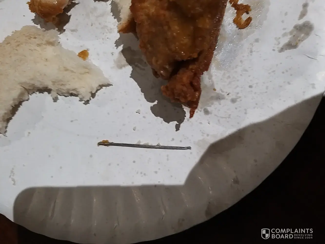 My 9 year old son took a bit on a chicken wing and bit onto a steel pin that was inside the chicken wing he immediately screamed as he hurt his tooth we inspected the chicken and found a steel pin inside the chicken wing something so strange and something i have never seen before !