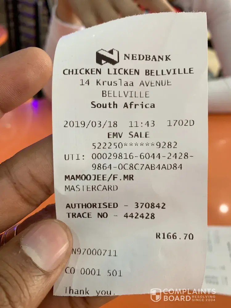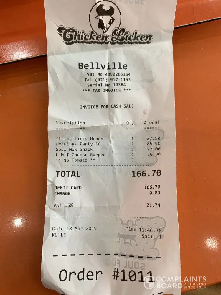 However, what has made me complain today is receiving even a worse product from Park Station where we have over 15, 000 employees who are likely to to be customers of Chicken Licken. I find such a health hazard and totally unacceptable. I hope that this will be addressed, immediately, and across the board.