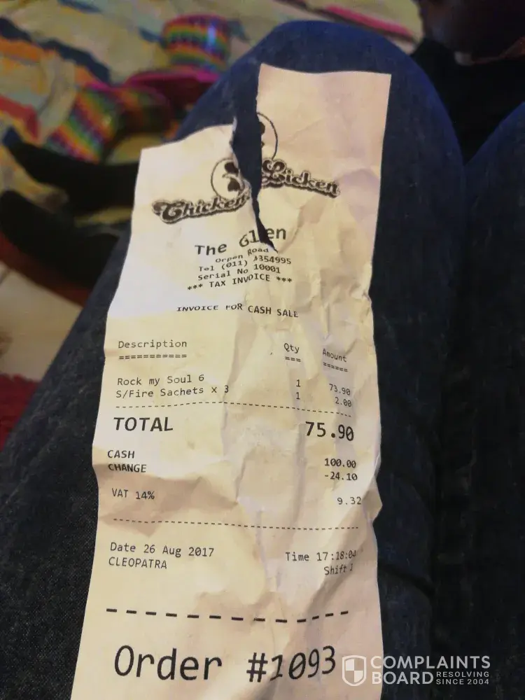 hi. I ordered a Boerie burger and a rock my soul 3 from chicken lichen rosebank today at about 11.20am on 12 July 2017. the shop was empty with no one at the counter. 2 people arrived after me and received there food before me. during this time the ladies was having a fat conversation with each other while I waited for my food. while I was waiting I heard something beeping at the back and which was completely ignored by the ladies. eventually I saw it was burger patties which I prayed was not mine as it was completely burned. I eventually got to the office and opened the box to a burnt Boerie burger drowned in the yellow sauce dripping. I ended up throwing the burger in the bin as it was not edible at all. this was such a pitty as I've been told about how fantastic the new Boerie burger is. Unfortunately I can't agree with it due to the pathetic service from the ladies at rosebank chicken licken. I would appreciate a reply in this regard and can be contacted on [protected]
