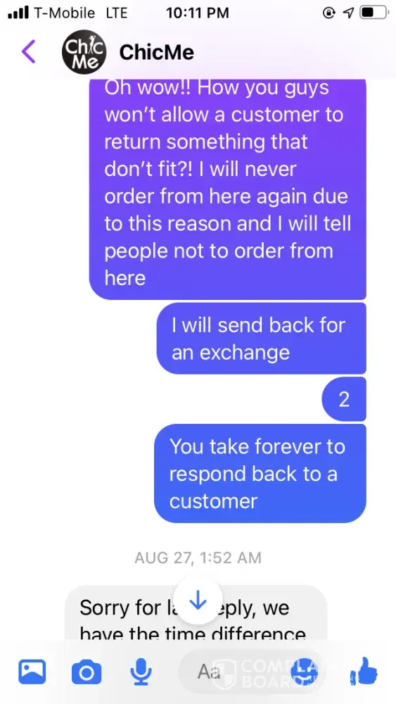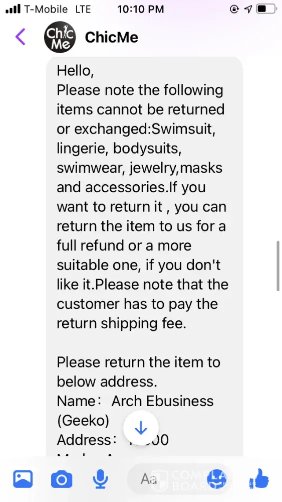 I purchased several items (7 to be exact) from this company because of the high ratings. However, when I got my items, the material was cheaply made and and very poor quality. I've email them and sent a refund request via their website. I originally was emailing Amiee and she was responsive the first email. After I explained to her I want to return all the merchandise because for all those reasons above, she then went MIA... I tried emailing several more times after that. I went through Amiee, Sally, and finally Cherry. When do get the finally get a response, they saying that I can't return it because it's past the 30 days. So this whole entire time, when it was in that 30 day period, ChicMe decides to not responds to my return request. Once when for sure it passes, you can't except it. I'm outraged by this poor business ethic and my purchase was over $100 that I just lost for no reason. Note: there is no return address that is provided on their website or order. You have to go through a request or talk to someone before all of that information is provided.