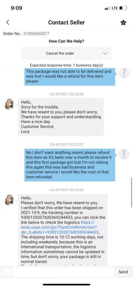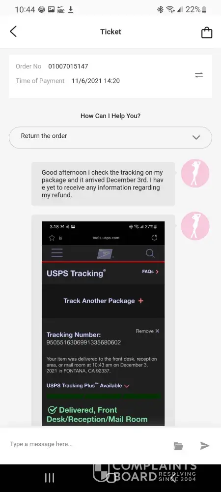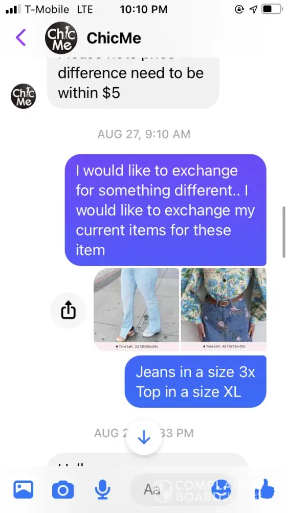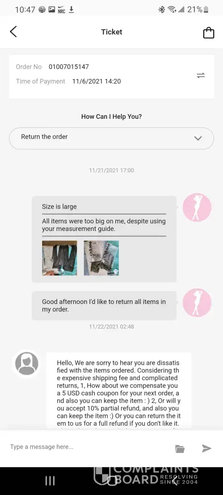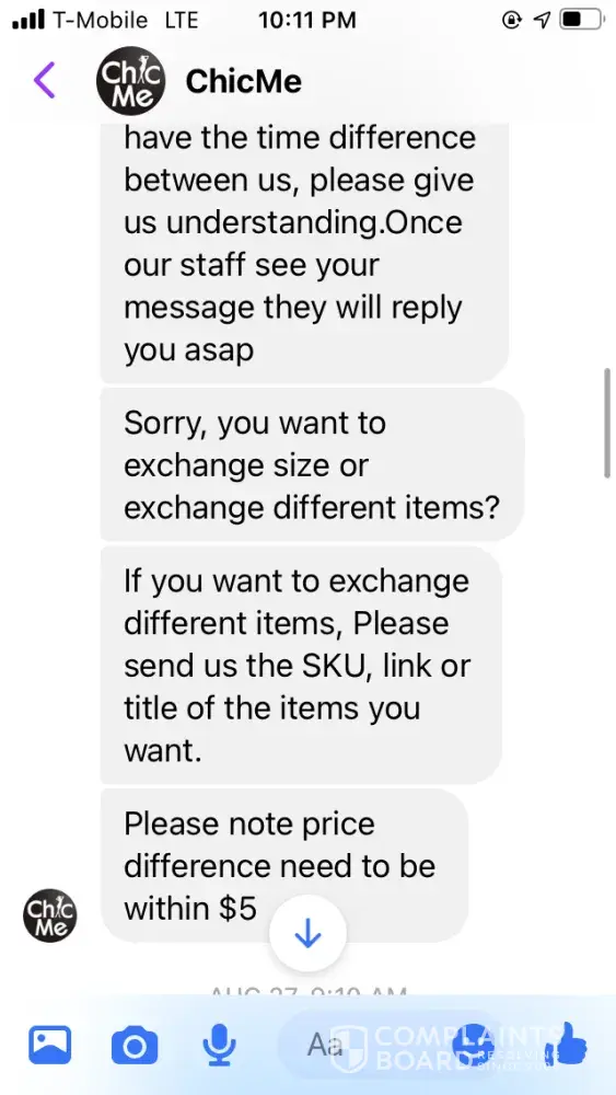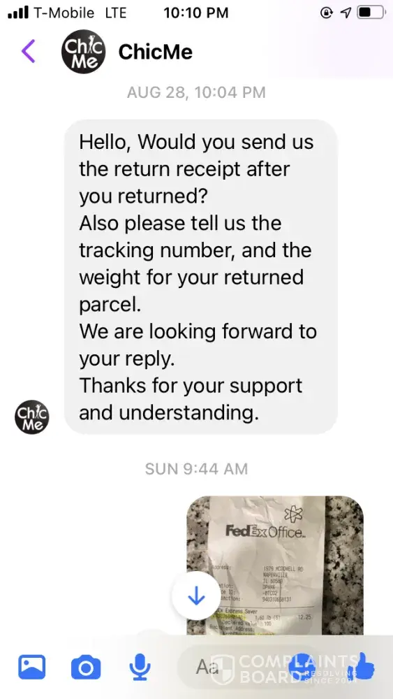 Ordered clothes from them that was my size, but when I got the clothes they were very small but supposed to be a large. I requested a refund because I knew I couldn't fit them just by looking at them… when I requested a refund, they said that I couldn't get my money back but I could get something else.. it's very hard to speak to anybody live and even in chat.. someone supposedly from the company was messaging me through Facebook messenger.. you can't get anybody to speak to at this clothing store or whatever it is.. I took my package to fed ex and got a tracking number and it appeared that the returns things were with them… I ordered something else and I've been waiting several weeks to get my items.. the person I've been talking to through messenger contacts me at all times in the middle of the night but shows this person be in Facebook during the day but won't respond to me until late at night…. This clothing store is horrible with bad customer service and bad quality/ too small clothing… I hate I purchased anything from them, this is very frustrating that I can't talk to anybody via chat or live..