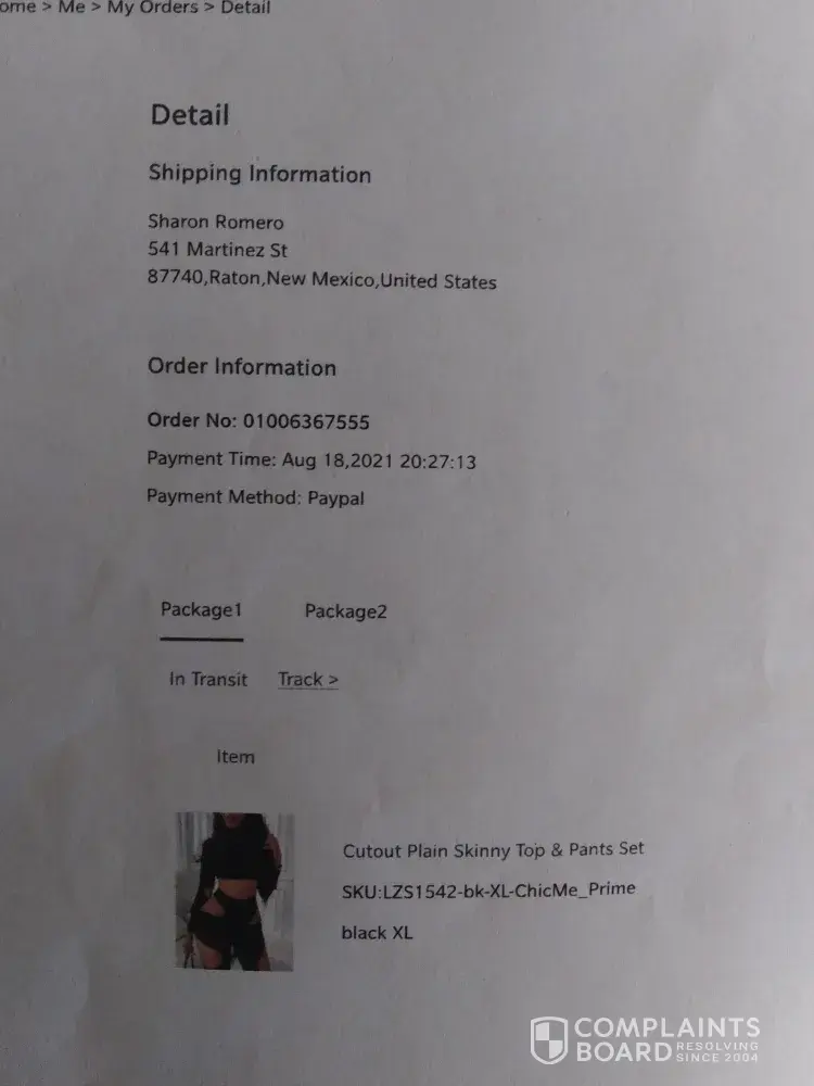 Very upset feel ignored I got no item I had to have PayPal issue a claim for amount 26.61 for cutout plain skinny top and pants set