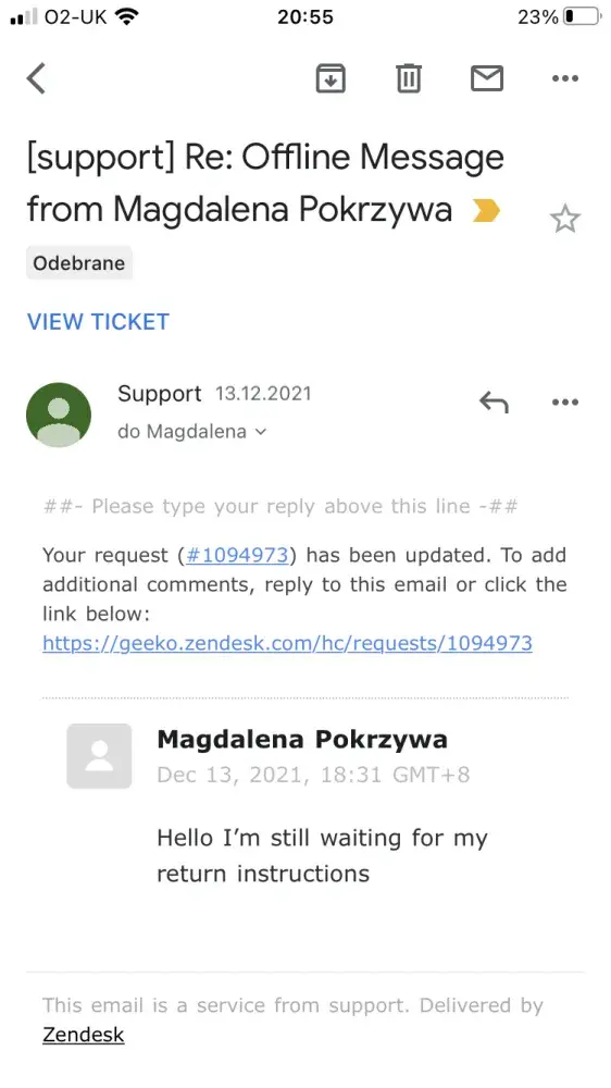From November I've been trying to get return instructions and after all the emails that I have sent that I want a full refund they have either not responded to me or they have offered me a part refund or they tried to tell me than it's past my return time . It's unbelievable how they treat their customers.
