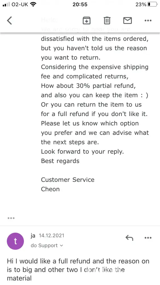 Eventually the clothes came and they were all terrible and absolutely nothing like the pictures online. I asked for a refund back straight away. I used their email function and their WhatsApp chat function as their online chat never works. I was told numerous times that the return shipping me was so high that I'm better off not returning the items. I was so upset and angry as the website clearly says easy returns etc. This is completely a lie as nothing is easy about this. I kept saying I want a return as over £300 is a great deal of money and the items are of terrible quality there is nothing I can do with them at all. They then said well you will pay a lot if shipping take 10% return price. I said absolutely not I have never heard of such an offer and they keep insisting on this offer on all of the channels and ignoring me. This company is clearly a scam and have made up false claims on their website for people to buy items like the returns are super easy and then make it so hard to do so that people give up.