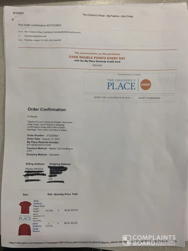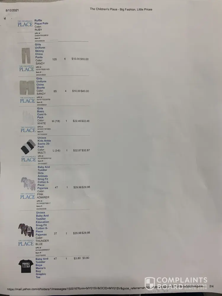 I had 2 orders but I am concern about the one that arrived August 6, 21 at 2:57. It was delivered by USPS. When I received my package it was already opened upon delivery. Everything was gone for the exception of 2 polo shirts and a Dino blue sweater. There was no receipt of anything for the exception of a package that included Doordash, KiwiCo, Shutterfly, and Geico. I am 76 yrs old trying to buy for my great grand for his 1st day at school, which is tomorrow. I called UPS, USPS, and most of all The Children's Place. The said the couldn't help me. I questioned my mailman and he said it was opened when it was delivered. I will never do anymore online orders. I was more than disappointed.