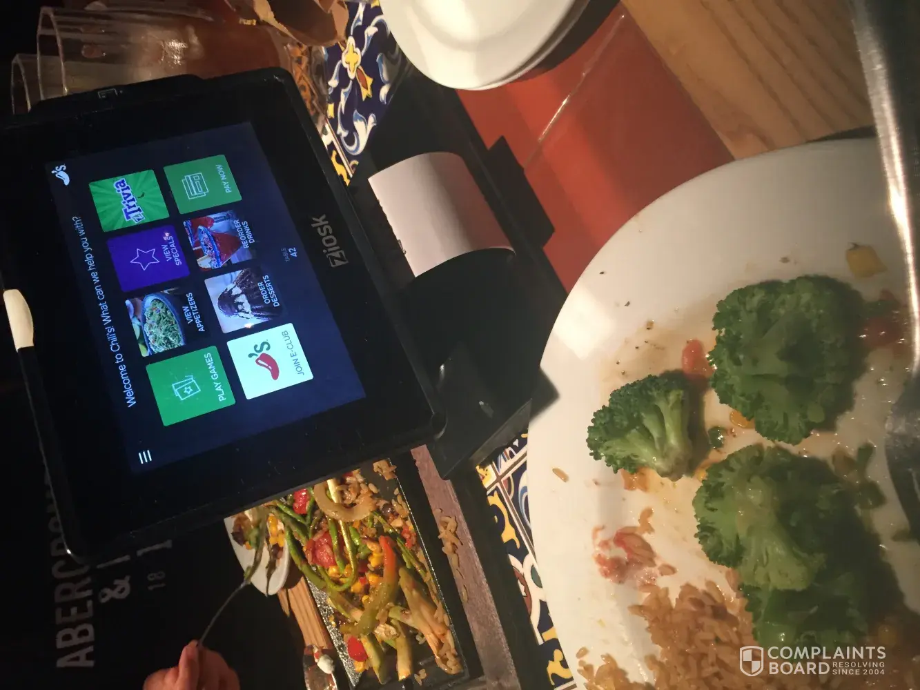 We ordered dinner last night from the Uniontown PA chilis. My husband returned home with an empty box where his quesadilla was supposed to be. I ordered my 3 year old the grilled chicken and cheesy pasta. The chicken was raw. Before I noticed it he ate a few bites. Hoping he doesn't get sick from this. Totoally ridiculous! Also my pasta I ordered was cold. We threw all of what we received in the trash. I will never return there.
