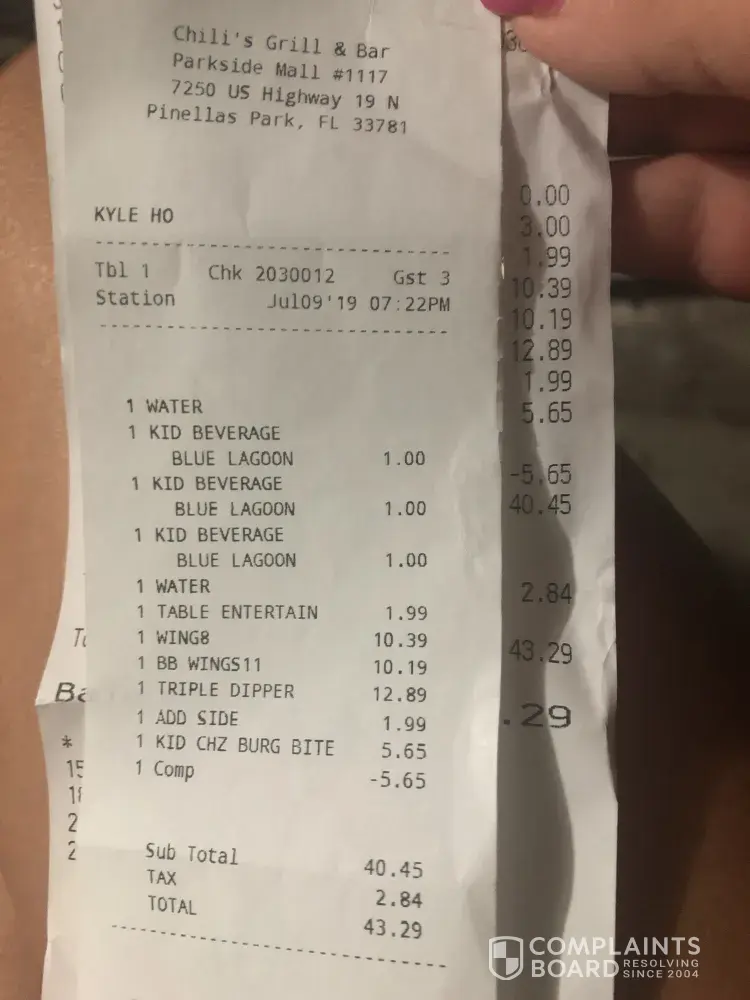 This is not the level of service we expect from chillis and as we are on vacation to the USA we always make a point of eating at least 3 or 4 times during our visits . The service and food we received last night has made us make the decisions we will not be returning to the restaurant unless we receive a satisfactory response to our complaint.