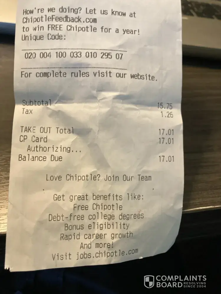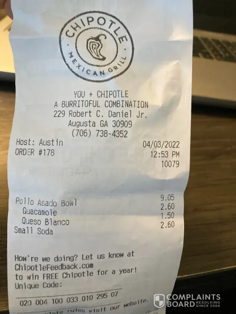 On March 24, 2022 at 5:13 PM we went to the Chipolte at 1840 Franks Parkway in Uniontown Ohio. Our receipt number is [protected]. After we ordered our two bowls I requested a small soft drink. I was informed by Alissa, who was taking our order, that they were all out of small cups, therefore I would have to purchase a large drink. Seeing the stupidity of this, that they were out of small cups and now were forcing the customer to spend extra because of their error, I questioned her? I stated "just charge me for a small drink and give me any cup". Alissa responded with "no, I cannot do that, it is against our policy". So we requested two water cups and closed out the bill.