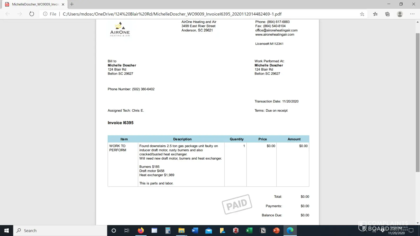 Nov. 19th Airone HVAC came and assessed our needs. I left a message with Tracey, our sales representative, but no response. Airone returned and fixed our heating unit today, Nov. 20. I received an automated call late last night with an inaudible message about a repair company that would assess our claim Nov. 23.