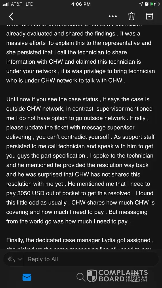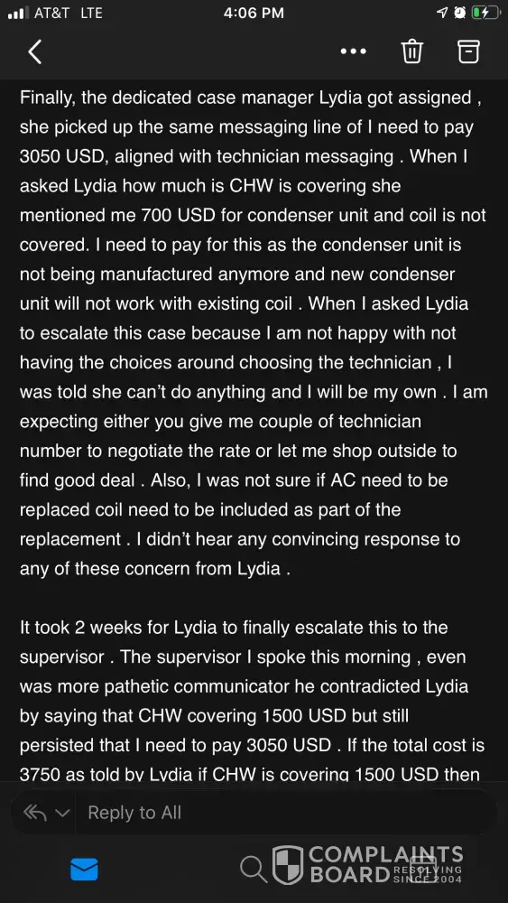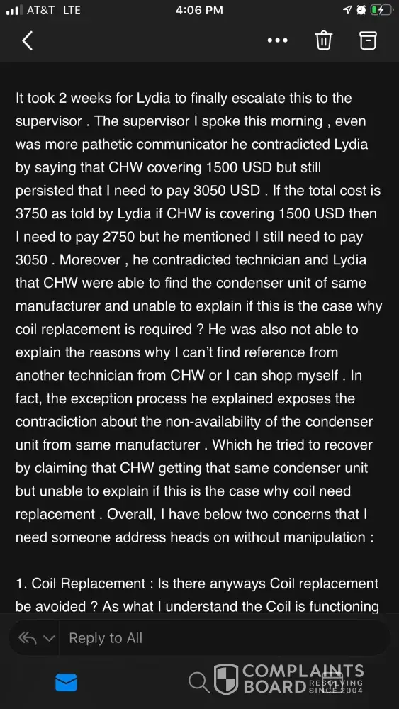 Then offered if I used their tech chw would cover labor, with tech who was out to get new system, can you say kickback.. I then chose to pay my own tech to come out and this company said only issue is blower motor is out, heat exchange not cracked, condensor fine. Now I can not even get a hold of anyone at chw.