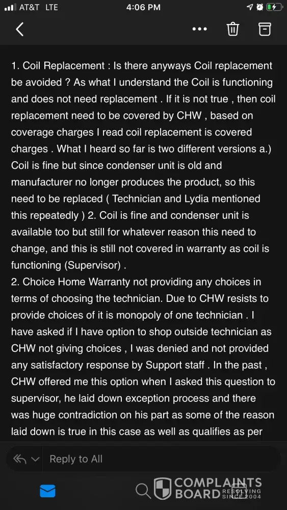Sounds like the technician who came to my home when my system stopped working. He filed a false report assured that choice would replace the system. I complained and explained that the system was serviced within the last 60 days and they denied the claim a second time.