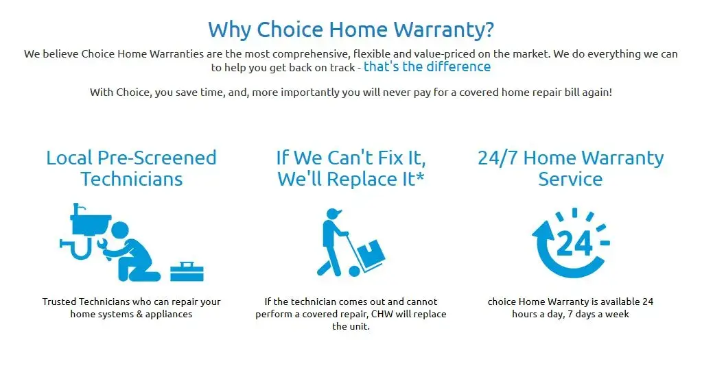 Choice is a scam. They take your money then focus how not to pay for repairs. They have loopholes in contract to refuse payment for anything. Their repairmen are the worst in the industry. So far they have refused to repair or replace my refrigerator, shower valve, dryer vent and washing machine!
