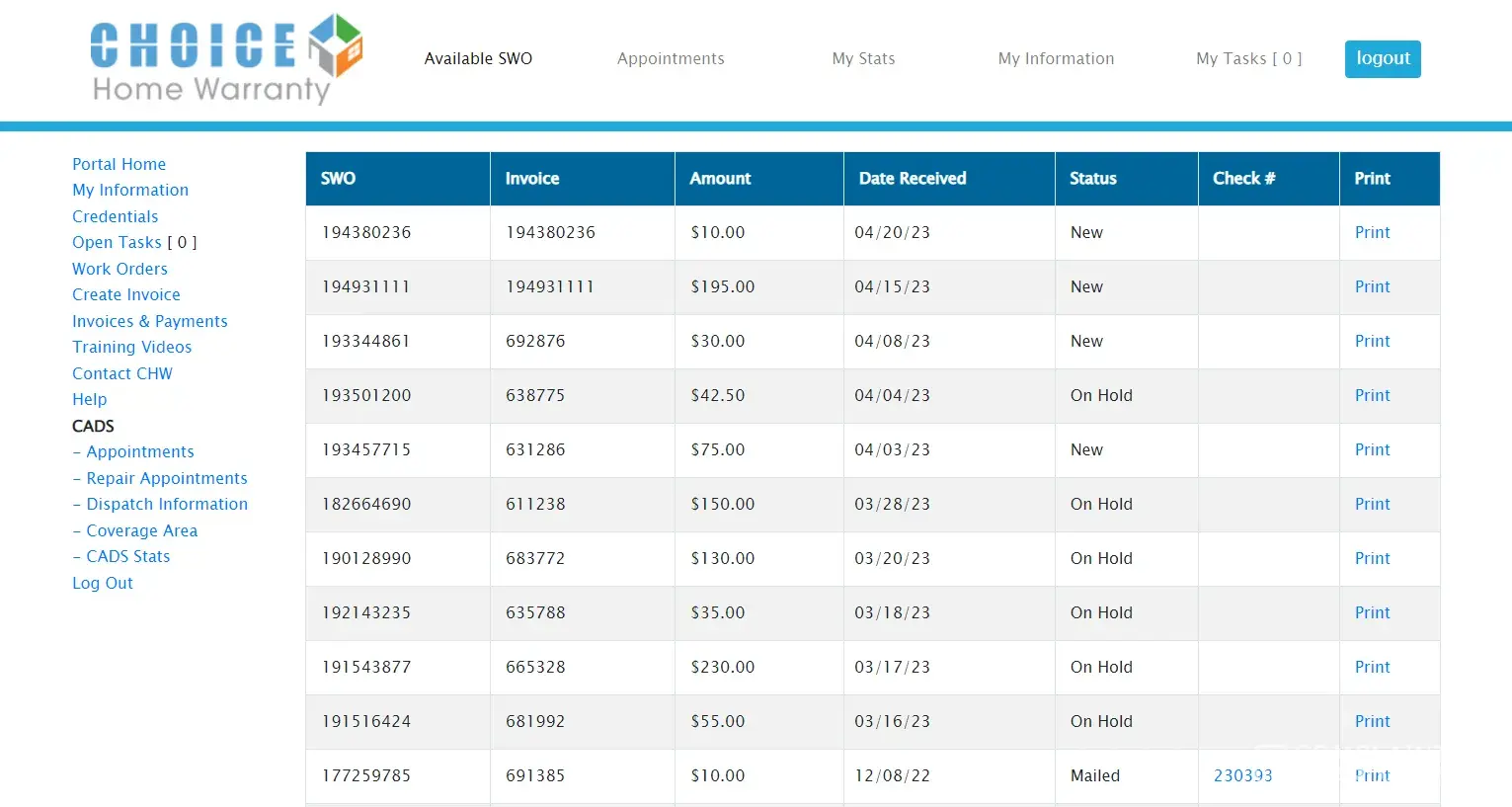 I have 10 open invoices with Choice Home Warranty. After the 1-month status of these invoices was changed to "on hold". After I sent my question they explain my account was removed due to the high cost of the claim and the high rate of reassign. My most claim is $230 and I never noted any reassigned job. Also, I check my STATS on the vendor portal of Choice Home Warranty and it proved they lied to me. I send them a message and respond there respond " At this time account will remain disabled". Also, this company refuses to pay sales tax. When I asked to provide Tax Exempt form they says they do not have this form but still will not pay sales tax. After it, they disabled my account.