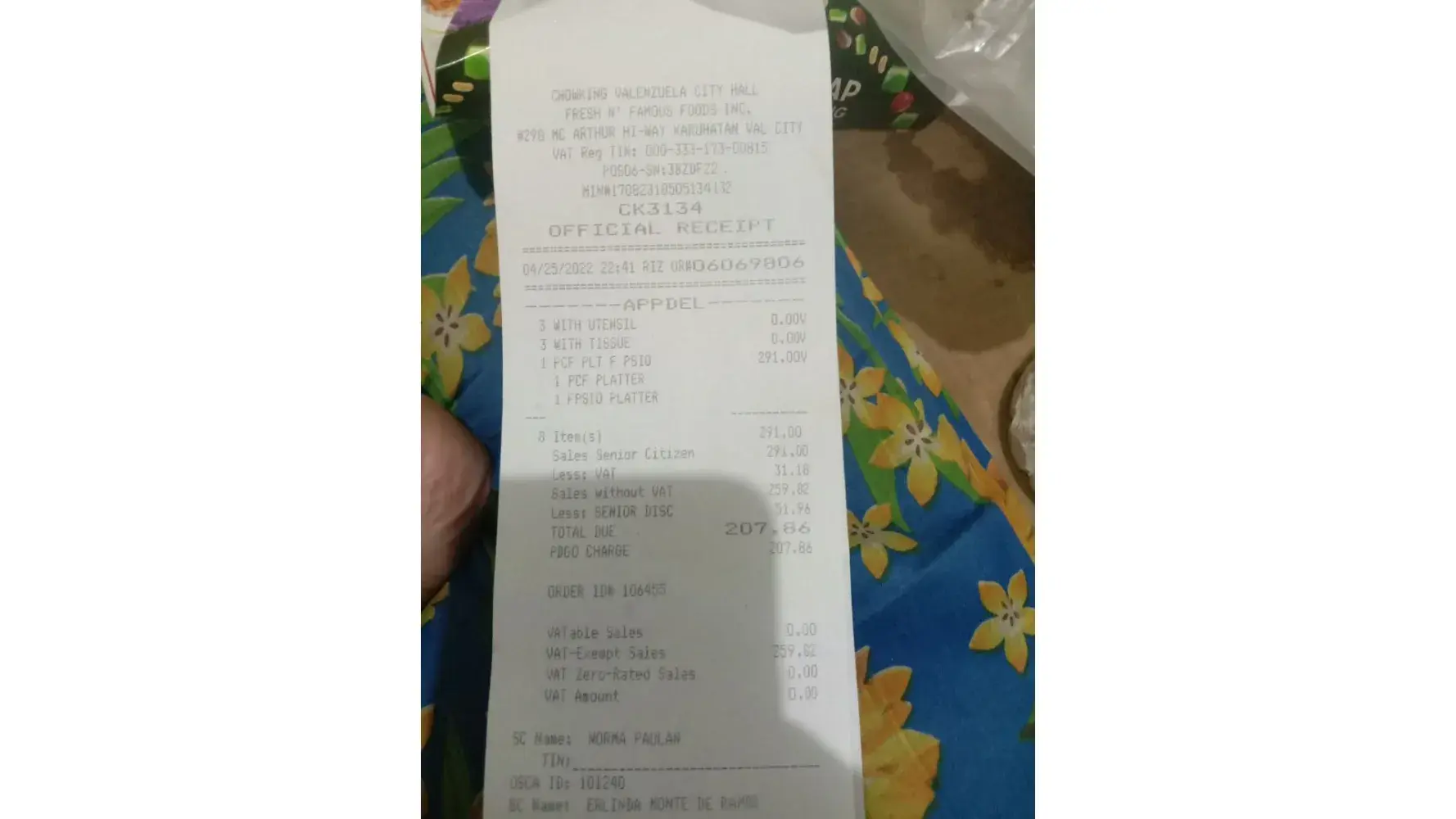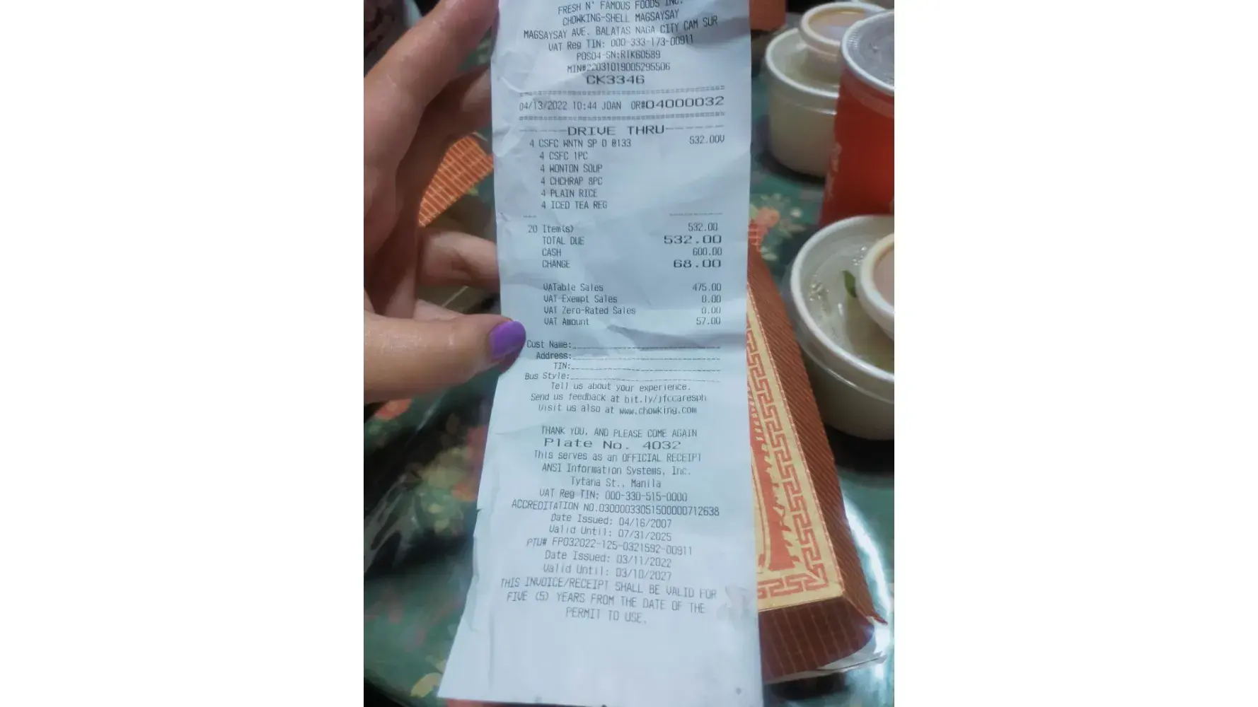 We ate at Chowking San Fernando Pampanga Branch near intersection area yesterday April 19, 2022 around 1:30pm (Not much customers)