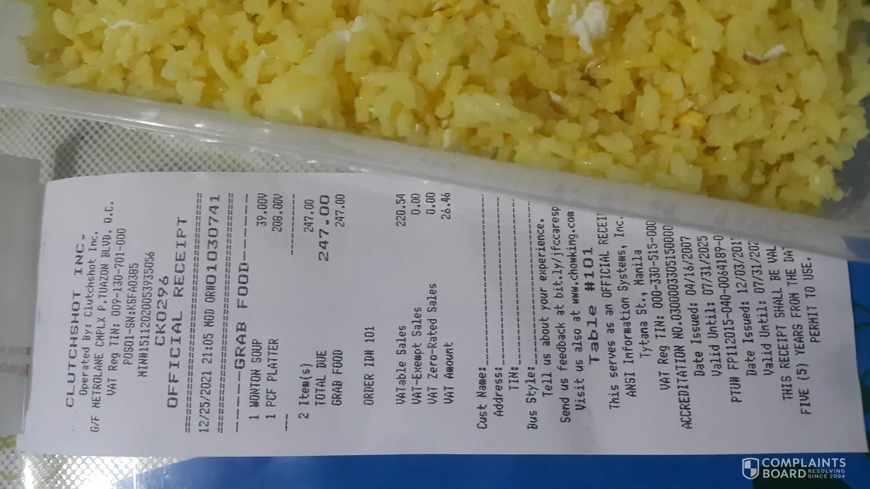 Today, february 23, 2022 at 11:37, I ordered (chaofan) and 1 box of chocopao, for takeout at chowking, sm bicutan, bldg a. When they call my number, I grab the product and left.