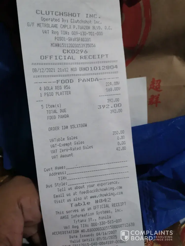 nagorder kami sa chowking pacita thru foodpanda, nagrequest kami for condiments (chili garlic, toyomansi, spoon and fork) walang dumating. tapos ung siopao walang sauce... ung tofu ang messy ng packaging. ndi na sana kami magccomplaint kasi napakasimpleng bagay lng naman.. pero 2nd time na kasi nanyare 'to.. ganyan ba tlga ang service? kasi sa foodpanda kami nagoorder? nakakadissapoint lang... ndi ako magccomplaint para sa kahit anu.. i just want you to be aware .. thank you...