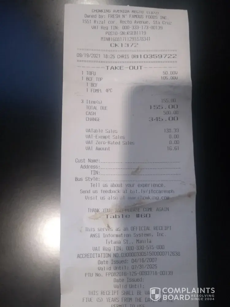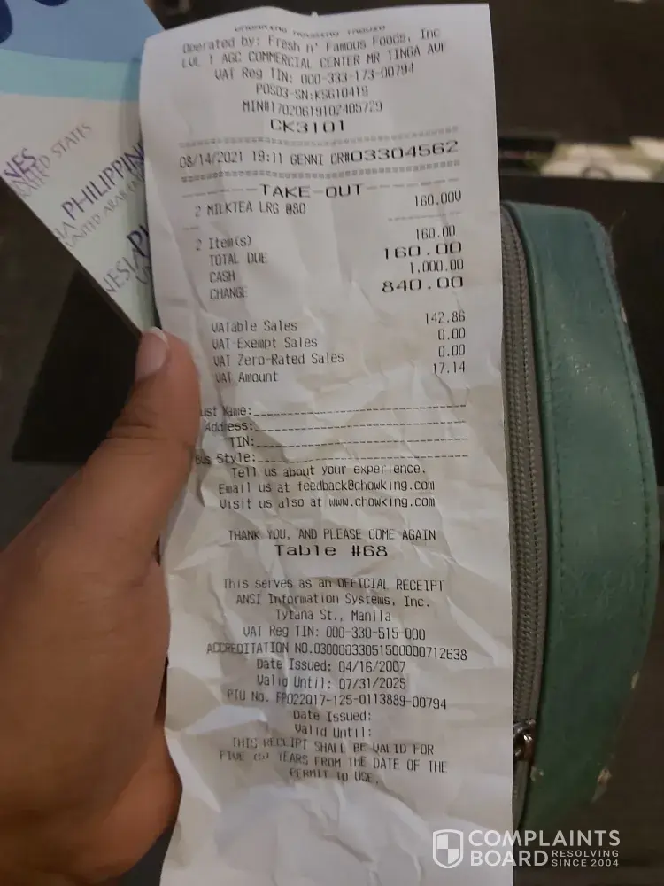 I am filing a complain to chowking robinsons lipa branch. I am writing this complaint just to remind the staff and crew of chowking! Please! Check the items or should I say don't make your customers mad at your service!