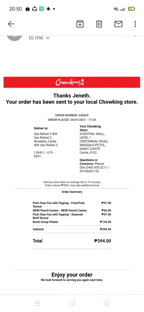 Pero nung kinain na po namin ito around 8:10 pm, yung kanin po ng chowfan niyo ay LASANG PANIS at amoy panis how come na ganun po nangyari, naiserved niyo po ba ito ng lapsed? Purkit po ba naka advance order ganun nalang po na isesrved? Kaya po siya nakapending ng 30 mins sa inyong device to make sure na bagong luto po yung maisesrve.