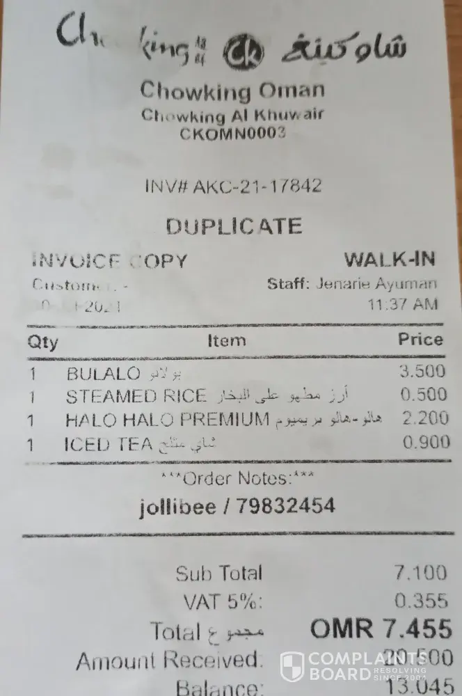 Chowking Oman - Friday July 30, 2021. INV # AKC-2117842 .