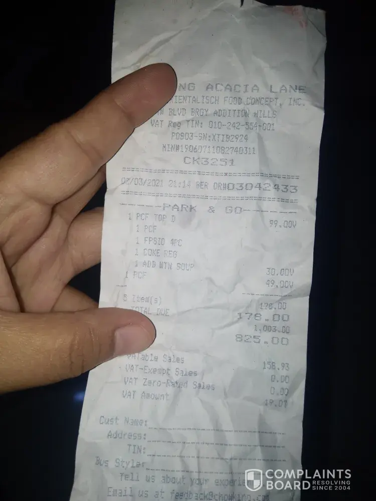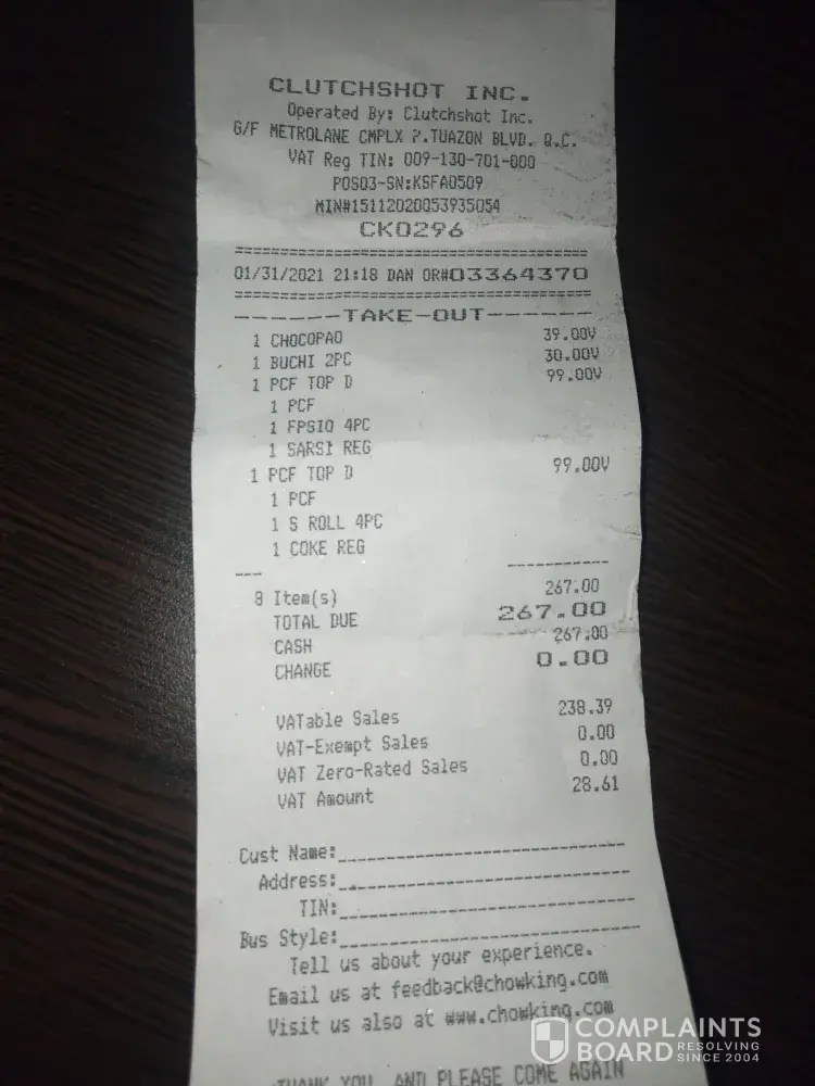 I order sweet and sour lauriat, 1pc chicken and small halo halo at 11:16pm and I got my order on 11:58pm. And I noticednthat my small halo halo is missing I tried to look for my receipt for follow up and i notice that the cashier failed to issued me an official receipt so i have to talk to the manager about it.