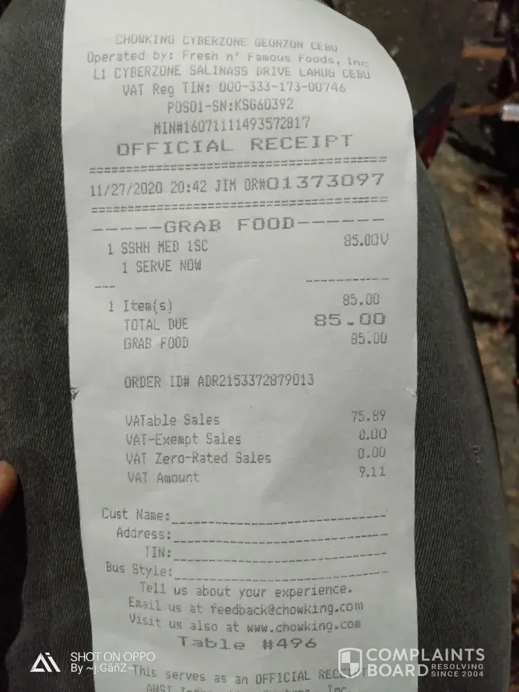 I ordered kangkong, chicharap, chowfan and wonton soup. But the guy delivered it without the soup on it. Chowking avenida recto