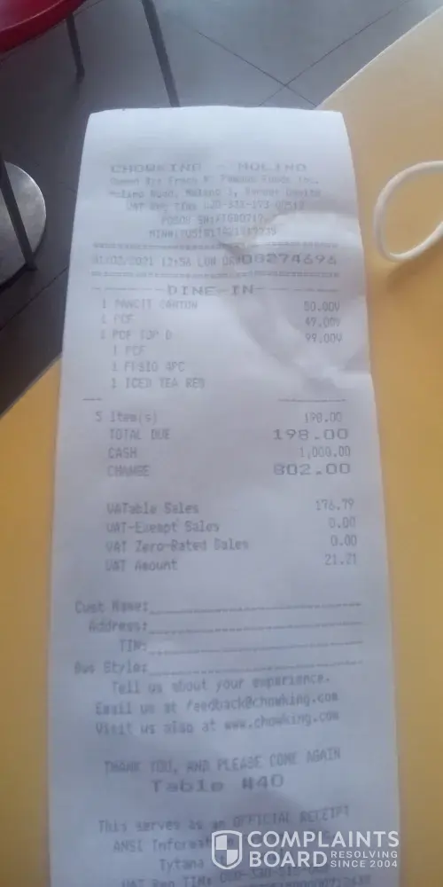 First time ko kumaen sa chowking pitx kanina, pero nalungkot ako ng iserved saken ay mali food instead na chaofan fried rice with 1pc chicken.. 1pc chicken with plain rice lng.. Tinanong ko kay crew kng bakit mali yung served n food dapt chaofan rice yun at hindi plain rice ang sagot nya saken plain rice lng dw yun.. Kita nman sa resibo na pcf (porkchaofan) un at hindi plain rice, hindi na ako nkipagtalo dahil gutom n rin ako sa biyahe.. Sana po maaksyunan nyo po yan na dapat po matraining lahat ng crew sa pagbabasa ng resibo at sa kitchen nmn po pakibasa po ng maayos ang resibo bago nyo iserved..