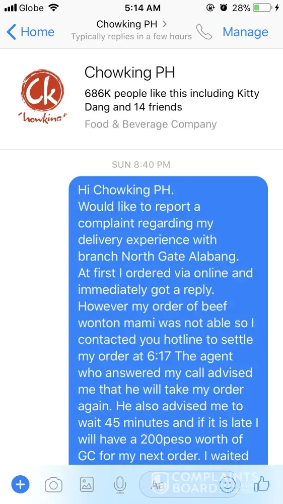 PS. I have sent this complaint last Sunday, December 03 thru Chowking's facebook; however, still no response. It seems that Chowking's team is not taking this seriously.
