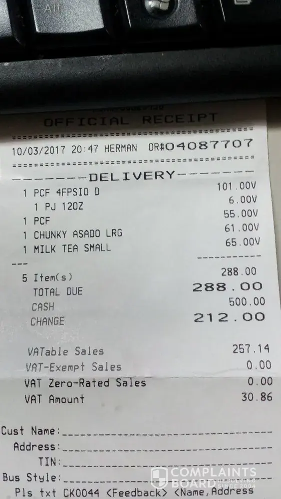 CK3141 Hi! I just ordered 4 pcs of pork siomai AWHILE AGO but i didn't get this order and I just arrived home now. Can you do something about this please? Thank you. Looking forward for your response. Asap. Raizza Cunanan of #34 Pucay Village Marcos Hiway Baguio City and oh by the way, the lady who's assigned in the counter named JOA based on the receipt is a bit irate and displeasing. and i find it annoying as a customer. The OR # is [protected], TABLE #86