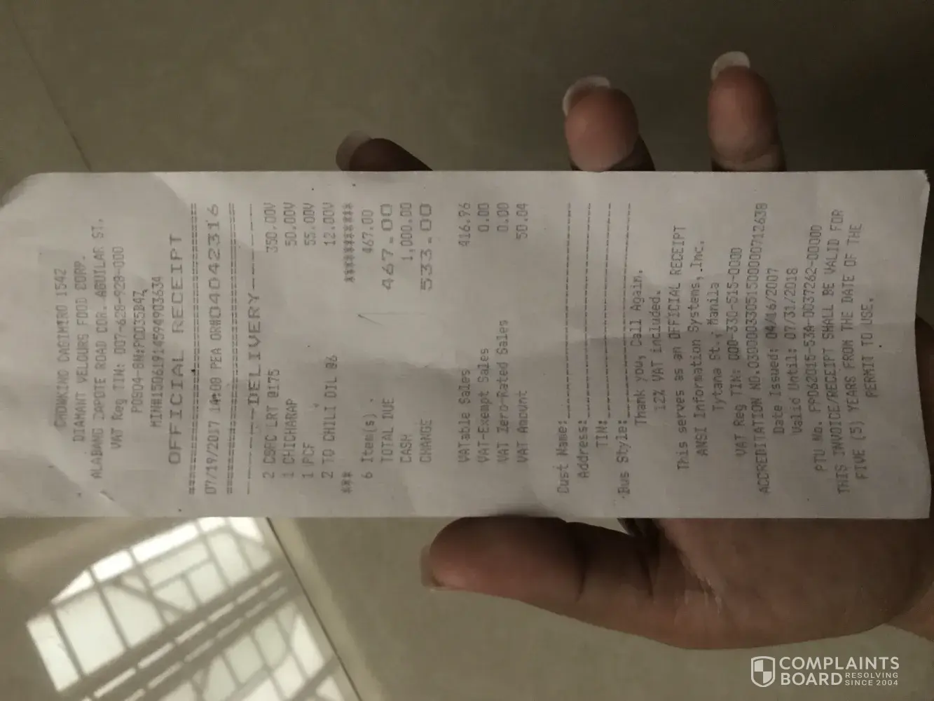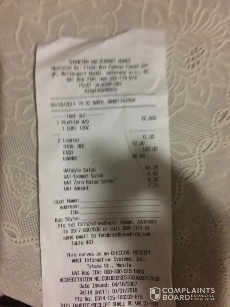 My boyfriend started eating his meal (chowfan with shanghai) and we were just talking. 15 minutes passed and wala parin remaining orders namin. We were bit in a hurry as my boyfriend has a basketball game. I was feeling impatient because I saw that the customers who just came were able to get their orders which I saw was also Chowfan with Pork Siomai. That meant na may products naman na available. My boyfriend then decided to follow it up. We waited for a few more minutes then wala talaga. A crew approached us then asked kung ano daw ba order namin. So inisa isa ulit namin yung order. We were very disappointed cause they did not even know our orders. that meant na we were waiting for something na hindi naman pala darating kung hind namin finollow up. My boyfriend even spoke to the manager. We waited for another 7-10 minutes para mserve yung remaining orders namin which were: 1 take out of chowfan w/o toppings and drinks then 1 chowfan with fried siomai. A crew served 1 take out chowfan and 4 pcs of siomai after a few minutes. We were like, seriously? where's the chowfan for dine in? yung supposedly lalagyan nyo ng siomai na toppings? sa isip ko lang po yun sinabi. I was really trying to be polite kahit na disappointed na ako sobra. The crew asked me kung nasan ang resibo. I told him to ask the counter as she asked me to leave it to her in the first place. Anyway, naserve namn nila yung lahat ng orders after a very long time but I already made up my mind na I will lodge a complaint about it. We asked the crew who served the food to give us a copy of the receipt. But he was not able to give us anything. The crew apologized for what happend pero I don't have anything against the servers kase they were polite. I was just disappointed with the counter as she is denying knowledge about the receipt she requested me to leave. After eating, my boyfriend and went to the same counter to ask for a copy of the receipt. We demanded for a copy of it but the counter won't give us any thing. She said that she is not aware where the receipt is. I reiterated to her that she asked me to leave it after I ordered our food. My boyfriend asked her to give us a receipt then she said, "Kelangan pa po talaga ng receipt?"