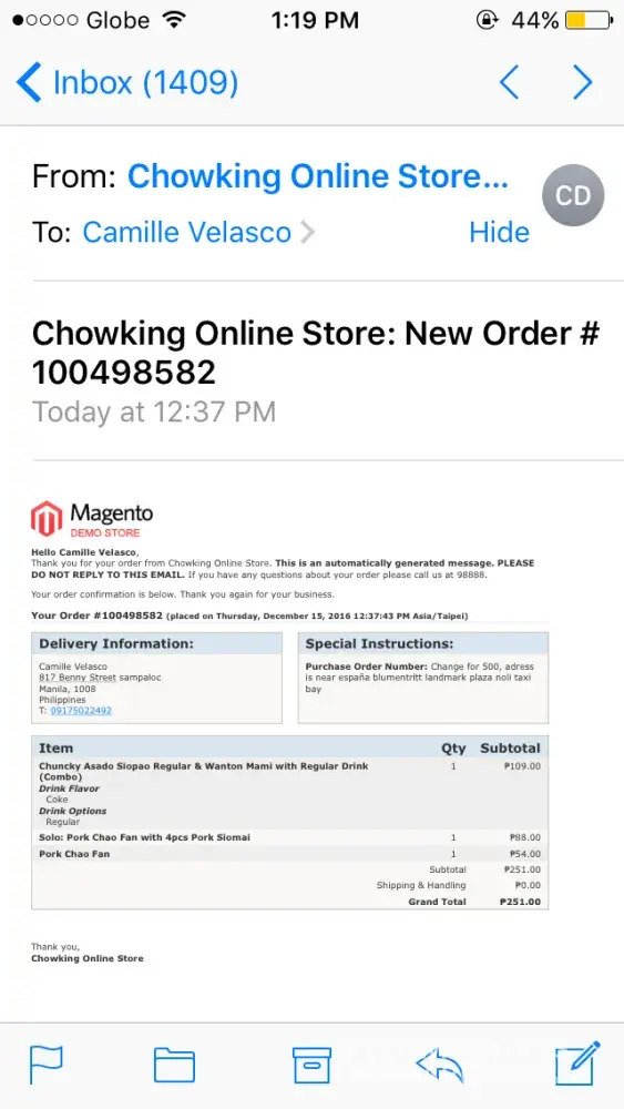 I brought online a combo meal of wanton mami with chuncky asado and regalar drink instead they deliver me a Chinese style chicken and chocopao. The delivery man told me that he will come back but he didn't i waited for almost an hour and a half. The store also called me but didn't do anything. I always purchase/deliver online specially i have a vey tight schedule and this is the 2nd time.