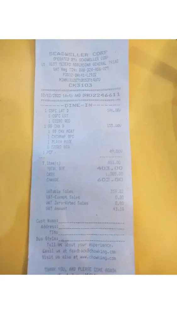 Desired outcome: I would like to have atleast an compensation for this inconvinience because this is a complete mess and also i was a chowking customer for almost 10 years however this experience is [censored].