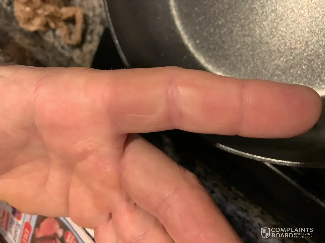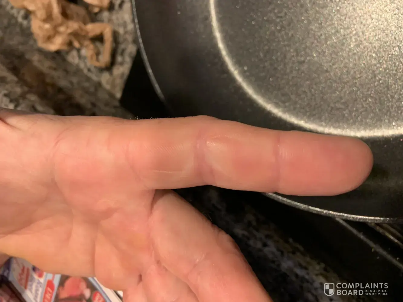 Purchased an Alta non-stick 11 inch frypan from Christmas Tree shops approximately 3-4 weeks ago. It states Heat resistant handle. While my husband was cooking breakfast on Sat. morning he went to take the pan off the stove and when he grabbed the handle near the top end his fingers stuck to the pan. This caused several fingers to be burned badly. They blistered within a day. I returned the pan and spoke to the manager of the store. I asked for a umber to speak with someone regarding this matter. He gave me [protected]. I was on hold waiting over an hour. When I finally spoke to someone they said I needed to call [protected]. I am still on hold 30 plus minutes later.