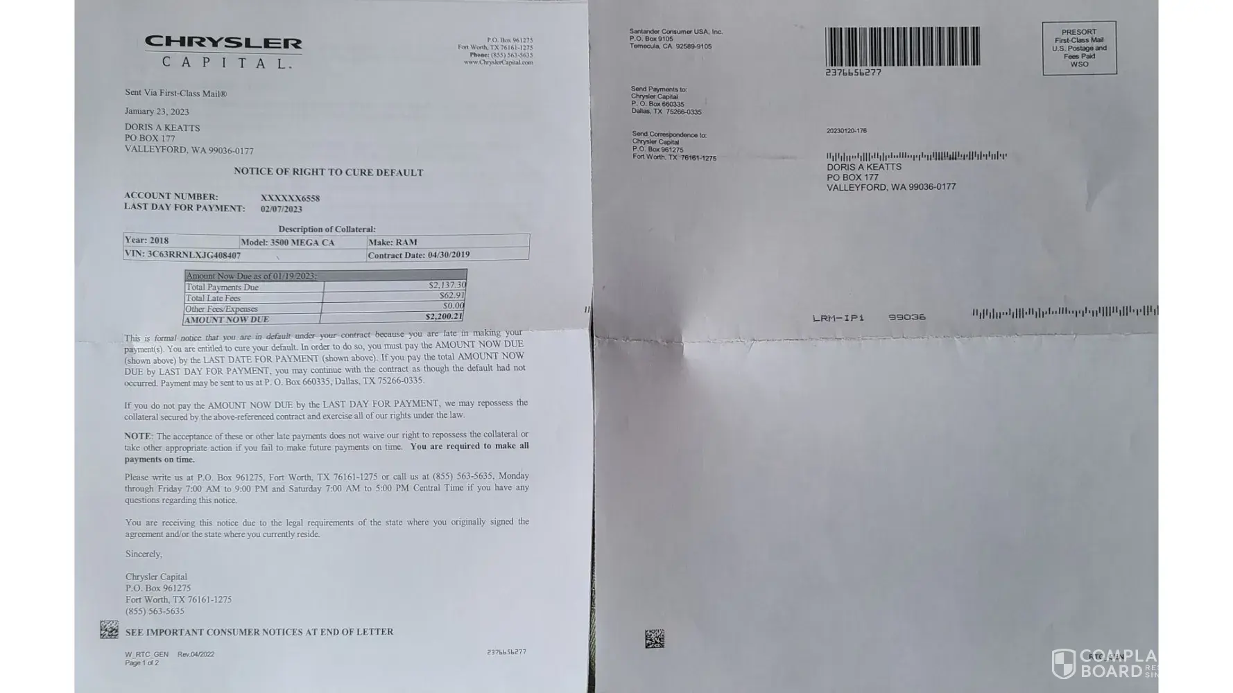 On 3/6/23 I decided to call Chrysler Capital again and verify that this letter was sent. I spoke with the following from Chrysler Capital: