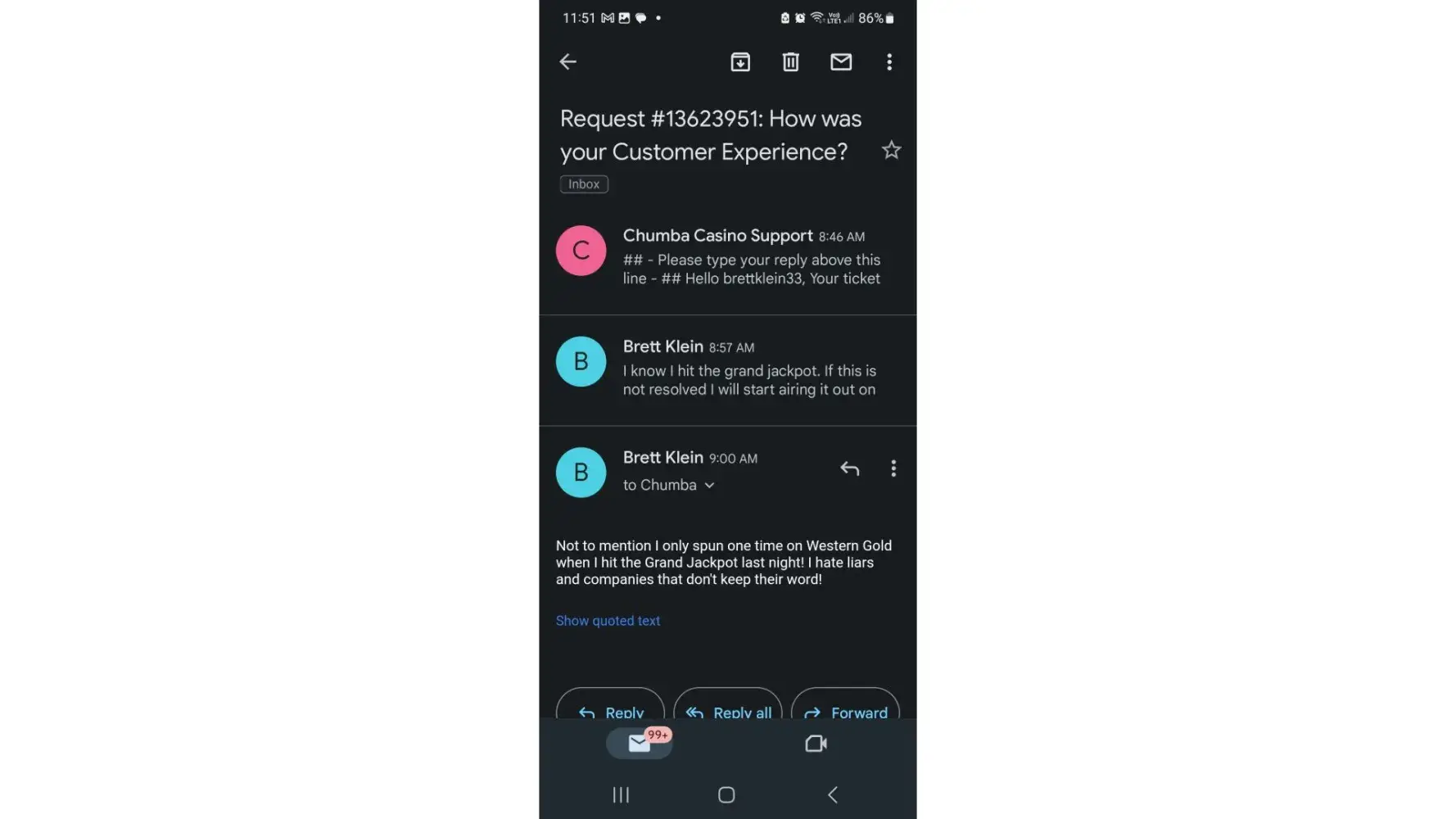 Complaint from [protected]@gmail.com reported on 22 October 2023 about Chumba Casino