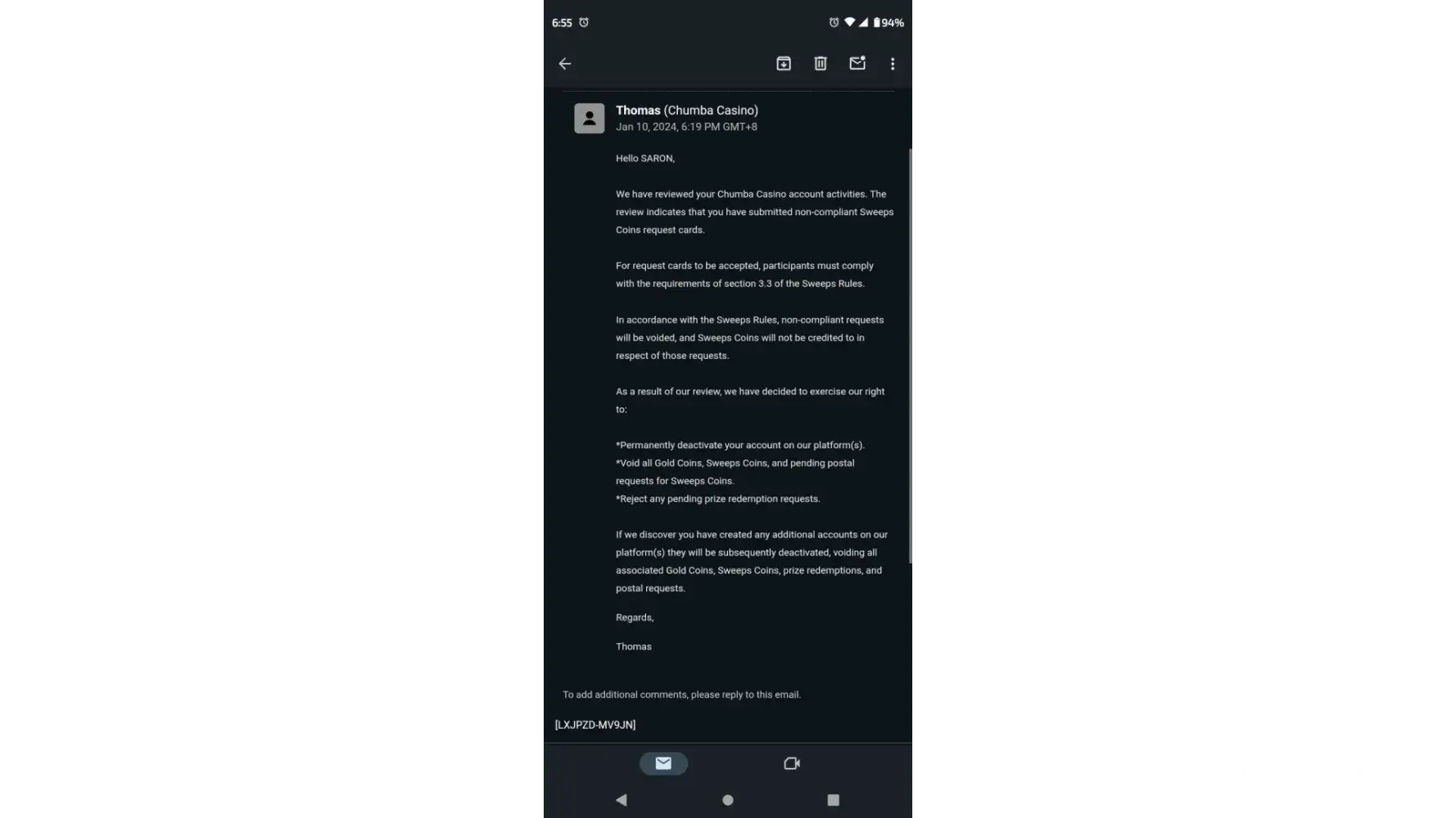 Chumba Casino had deactivated my account and sent me an email saying I was non-complaint with their 3.3 sweeps rules terms and conditions as to me, mailing in requests to get sweeps coins. They didn't give me a specific reason on why I have received the notice to what I did wrong.I also emailed them to help me update my phone number and new address since I have recently moved in December 2023 and instead of guiding me through the process, they closed and blocked my account. I also, have a little over 400 envelopes that had been sent out and the last day I sent it was November 21, 2023 and now due do this accident of my account being blocked, I will no longer have access to login in and no sweeps coins will be added to my account. I would like for them to help me update my new address and phone number and reactive my account and get my credits that was owed knowing I did follow the sweeps rules.