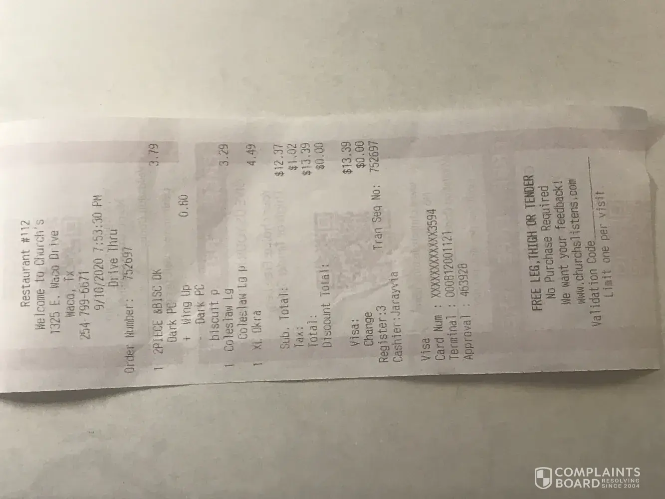 Churches Chicken #10341 101 S. Prairie Street, Union Springs, AL 36089 [protected] Date of Incident 1/31/2021 2:48 pm, station #1 check #100060. management: rachardonnay My self and my husband arrived at the store and I ordered the 20.00 special mixed, 2 large side ($22.00) total at the drive through. I was told by cashier that it would be 15 minute...