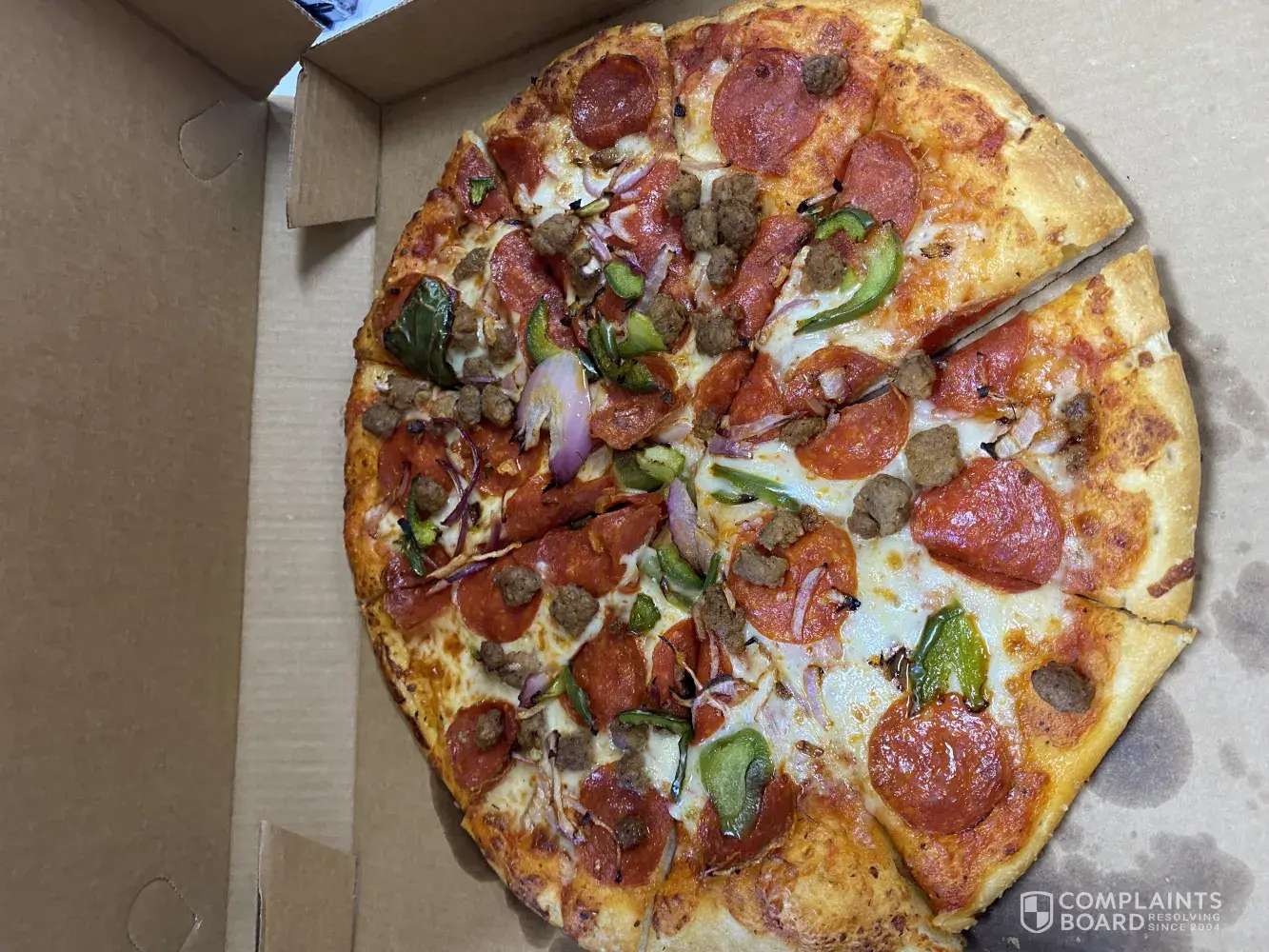 I ordered a supreme pizza with no mushrooms. Extra pepperoni. Picked it up no way I was giving extra pepperoni that I paid for. Looking at the photo you can't tell me that's extra. If that's considered extra you shouldn't charge for it, because looks pretty regular to me. Just think if this was your order that you paid for or your money spent. It was no...