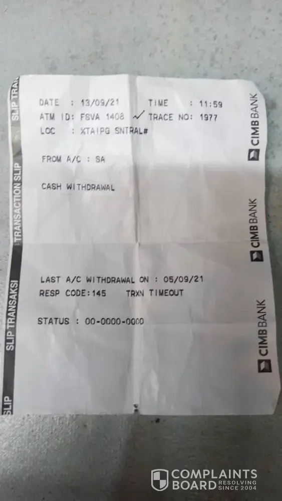 I am very disappointed with your bank and had an awful experience while withdrawing my cash at ATM in Taiping Sentral on 13/09/2021 at 11.59 am. I tried to withdraw RM1000 on the day, after few second my transaction was declined and no cash is withdrawn from the ATM. The next day when I check my account I found that RM1000 have been withdrawn from the account. I went to CIMB branch in Taiping to resolve the matter but the staffs there directed me to call Consumer Contact center. I've been trying to call your Consumer Contact center (+[protected]) for two days consecutively and nobody answers my call.